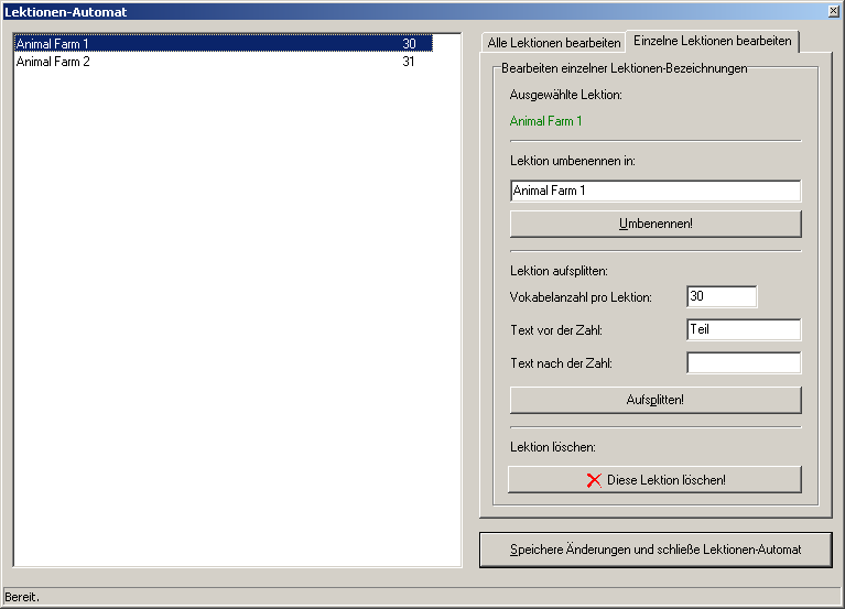 Hier können Sie eine einzelne Lektion automatisch aufsplitten lassen. Wenn Sie zum Beispiel eine Lektion mit 300 Vokabeln haben (was viel zu groß ist, um vernünftig lernen zu können), dann können Sie die Lektion beispielsweise aufteilen in 10 Lektionen mit je 30 Vokabeln. Die neuen Lektionen enthalten per Voreinstellung die Ergänzung „(Teil n)“ im Lektionen-Namen, wobei n eine natürliche Zahl ist, also zum Beispiel „Unit 1 (Teil 1)“, „Unit 1 (Teil 2)“, „Unit 1 (Teil 3)“ und so weiter. - Einzelne Lektionen bearbeiten: Lektion löschen
