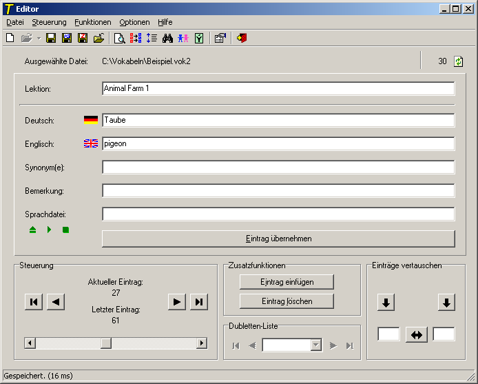 „Eintrag einfügen“ bewirkt, dass vor dem aktuellen Eintrag ein neuer Vokabelsatz eingefügt wird. „Eintrag löschen“ löscht nach einer Sicherheitsabfrage den aktuellen Eintrag.