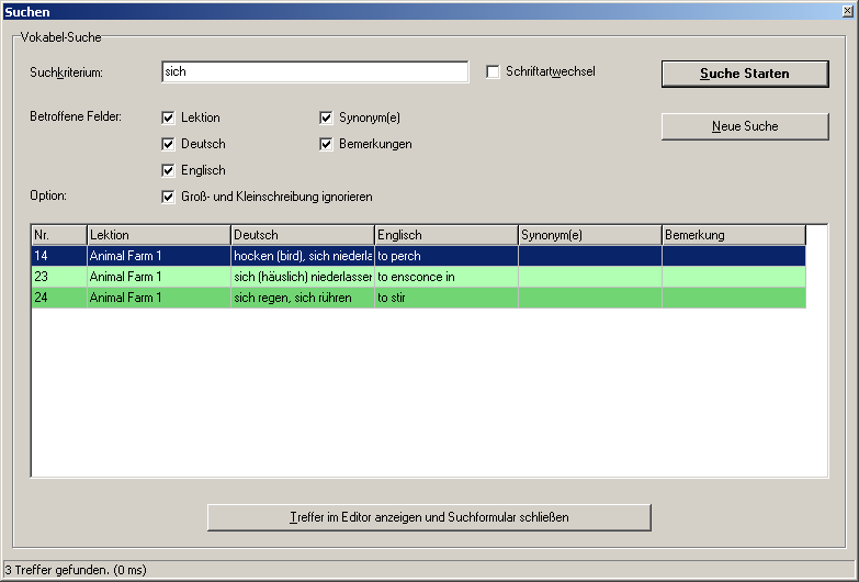 Im Suchformular können Sie einen Suchbegriff eingeben, nach welchem die gesamte Datei durchsucht wird. Sie können dabei auswählen, welche der fünf Felder pro Vokabelsatz durchsucht werden sollen und ob die Groß- und Kleinschreibung ignoriert werden soll.