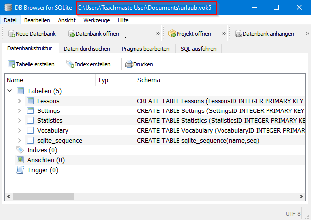 Die Vokabeldateien ab Teachmaster 5.0 haben die Endung .vok5 und sind nichts anderes als SQLite-Datenbanken. Die Dateien können also nicht nur mit Teachmaster geöffnet werden, sondern mit jedem anderen Programm, das mit SQLite-Dateien umgehen kann, z.B. mit DB Browser for SQLite.
