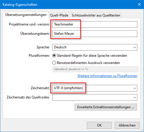 Zum Abschluss gehen Sie noch zu den Katalog-Eigenschaften (ALT+Eingabe), tragen eine Bezeichnung für den Projektnamen ein und wählen als Zeichensatz UTF-8 aus. Bei Interesse können Sie als Übersetzer gerne noch Ihre Kontaktdaten eingeben.